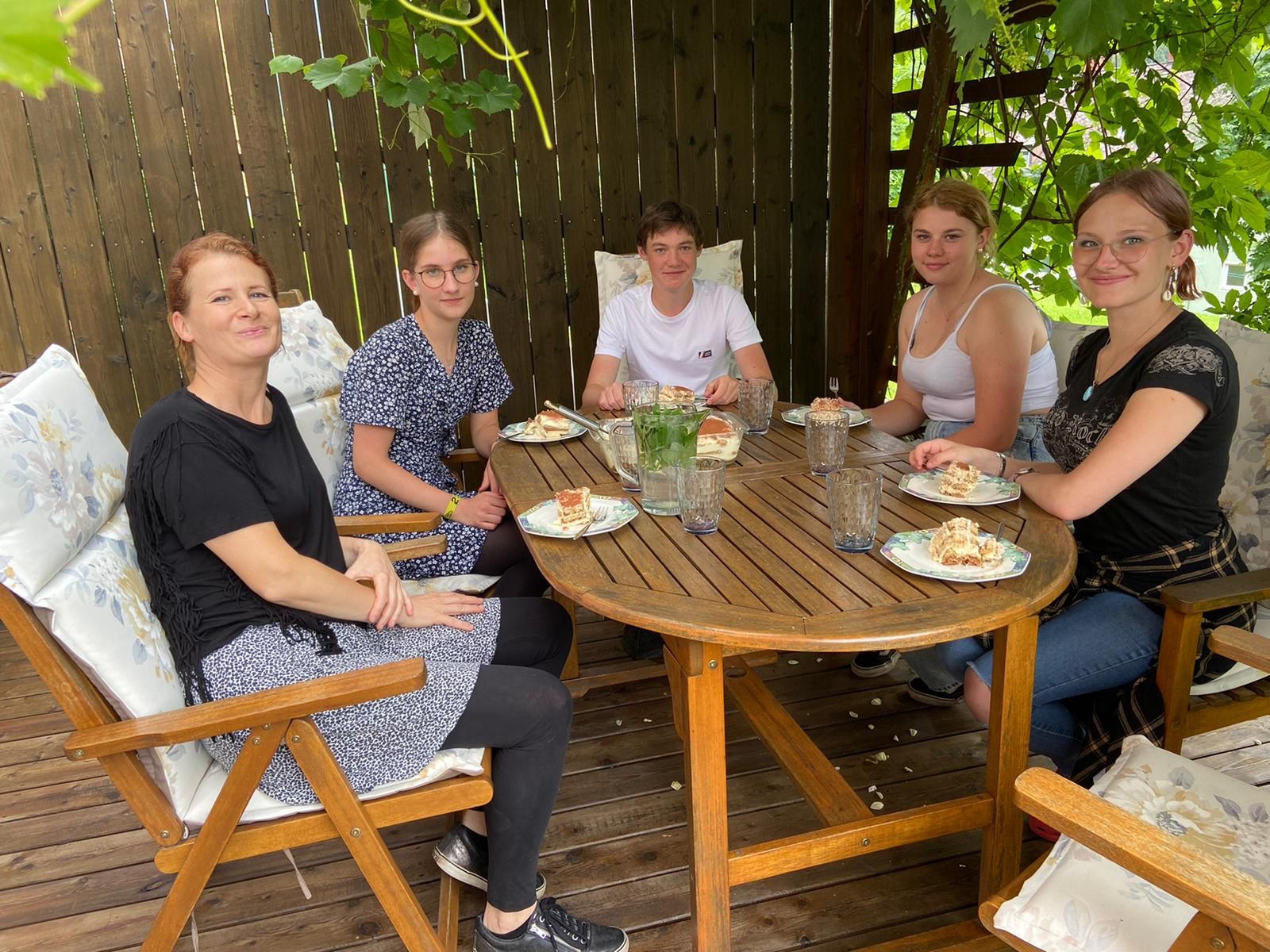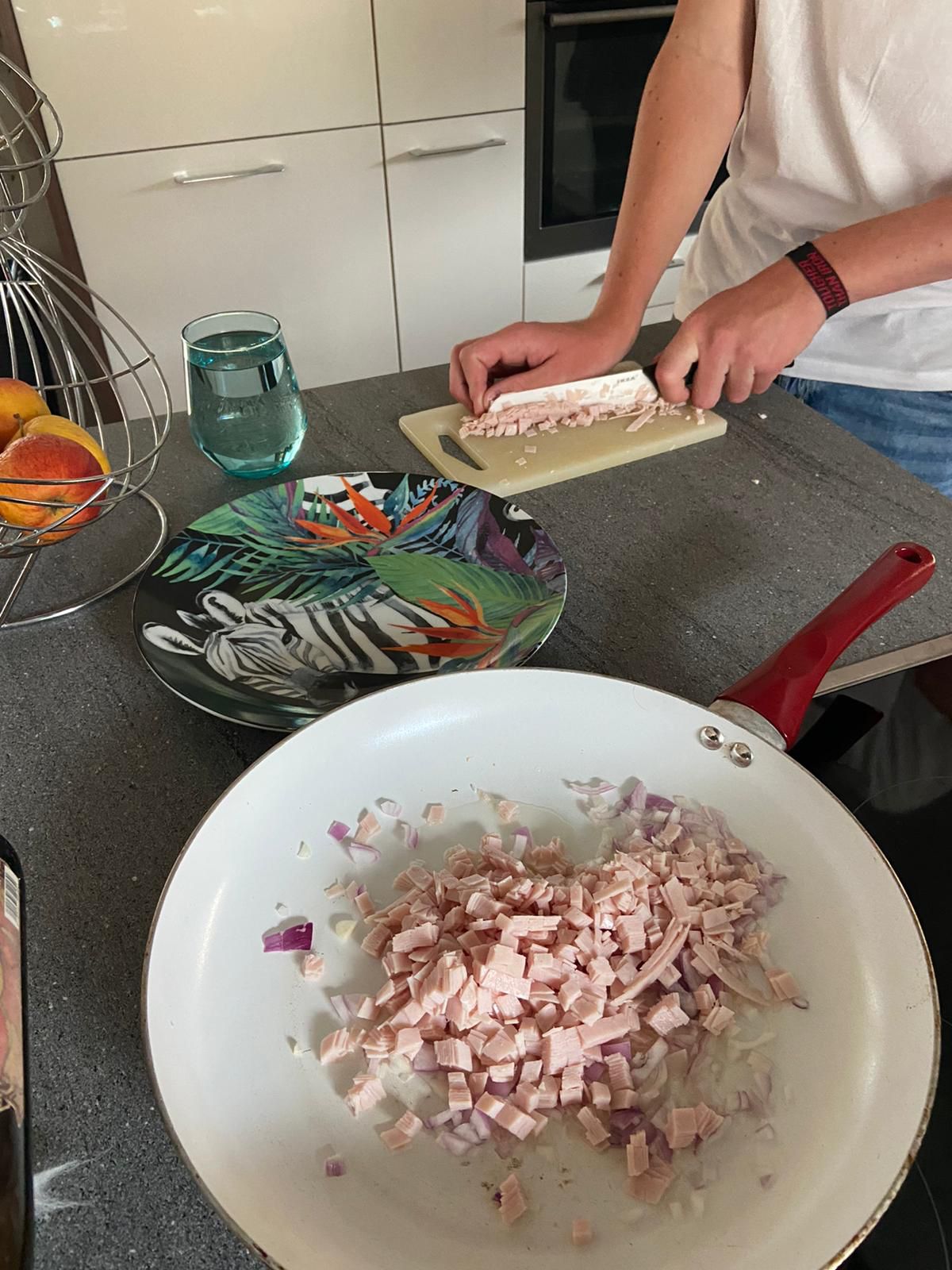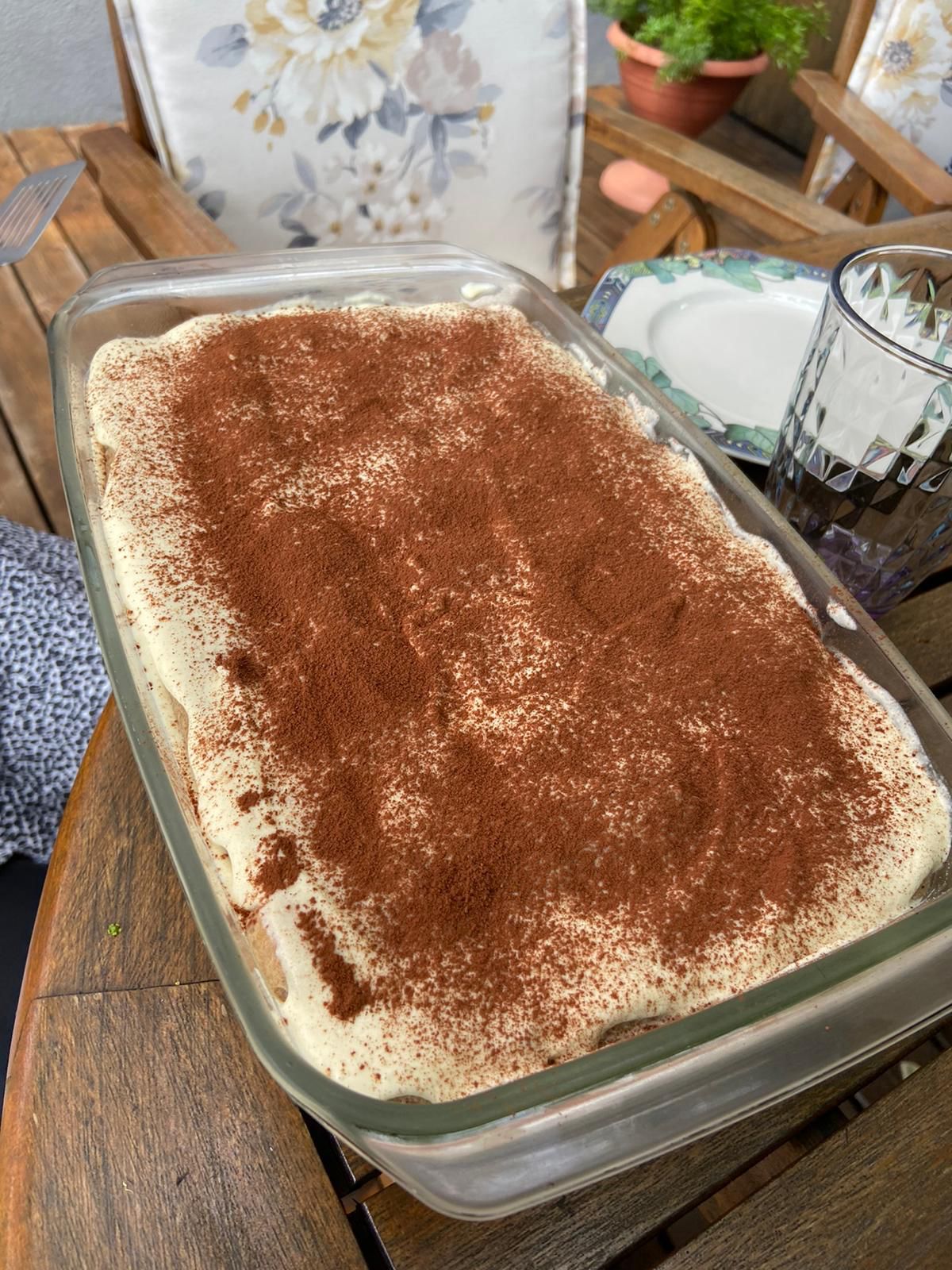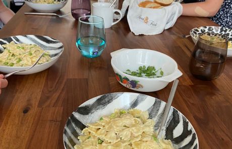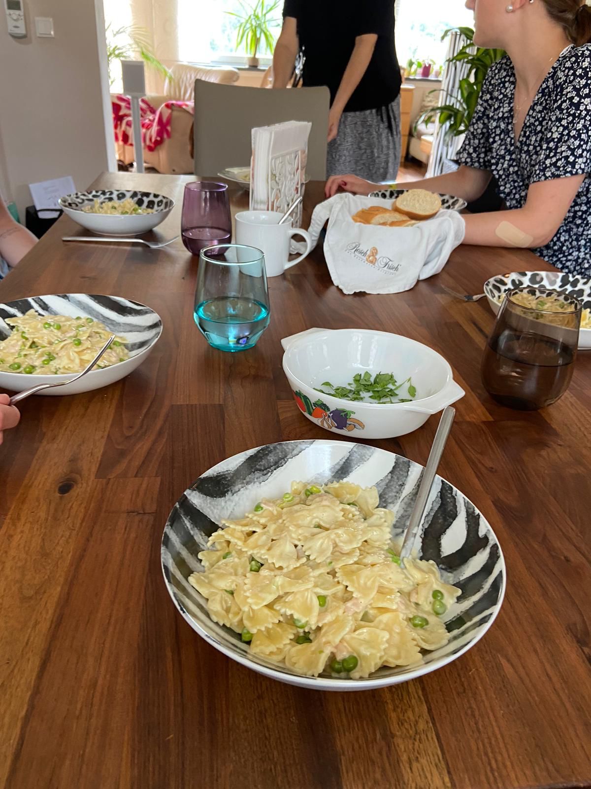 Als Vorspeise gab es einen Klassiker: Pomodori, Mozzarella, Basilico fresco condito con lemone, olio d’oliva, aglio e sale. Danach erfreuten wir uns eines traditionellen Nudelgerichtes aus der Emilia- Romagna: Farfalle all’emiliana con piselli, cipolla, prosciutto, panna, e parmigiano fresco. Es wurde geschnippelt, gerührt, gesalzen, gekostet, angerichtet, aufgedeckt: Mit der passenden italienischen Musik fühlten wir uns wie in Italien und genossen zum Ausklang auch noch ein Tiramisù auf der schönen Gartenterrasse. Grazie a tutti!