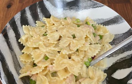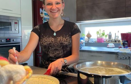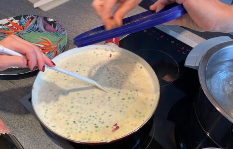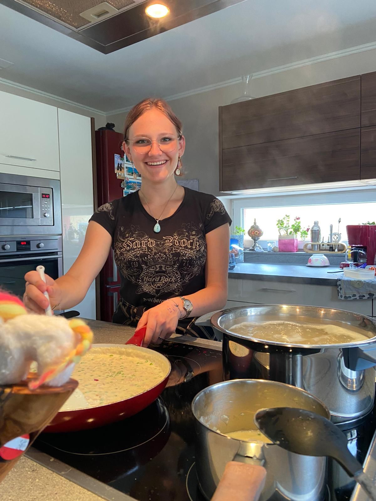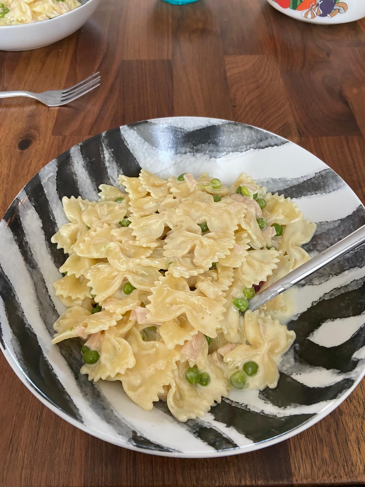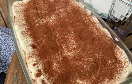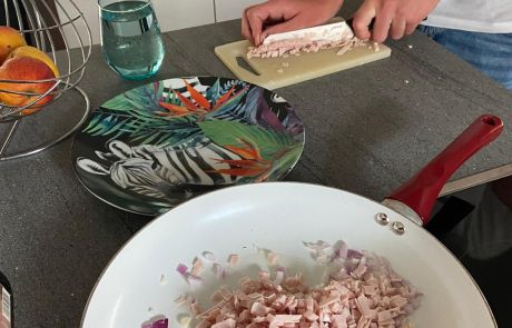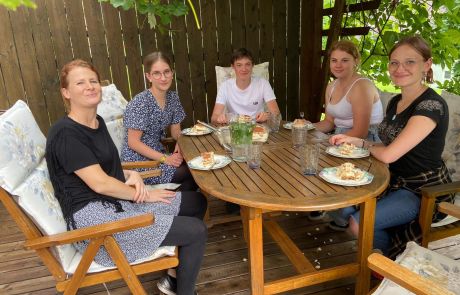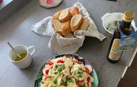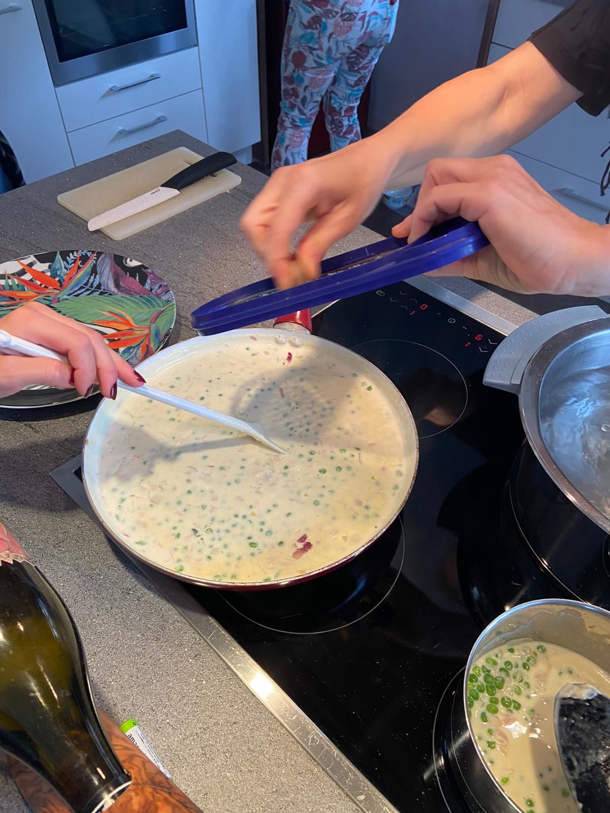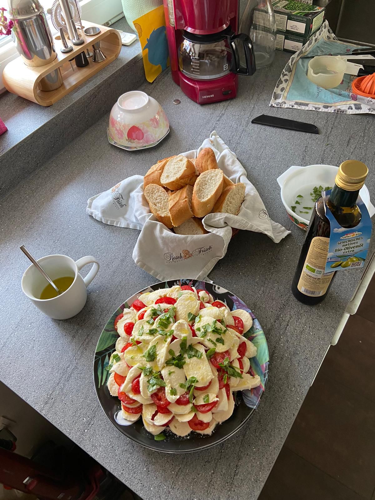 Als Vorspeise gab es einen Klassiker: Pomodori, Mozzarella, Basilico fresco condito con lemone, olio d’oliva, aglio e sale. Danach erfreuten wir uns eines traditionellen Nudelgerichtes aus der Emilia- Romagna: Farfalle all’emiliana con piselli, cipolla, prosciutto, panna, e parmigiano fresco. Es wurde geschnippelt, gerührt, gesalzen, gekostet, angerichtet, aufgedeckt: Mit der passenden italienischen Musik fühlten wir uns wie in Italien und genossen zum Ausklang auch noch ein Tiramisù auf der schönen Gartenterrasse. Grazie a tutti!