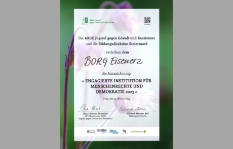 Es freut uns bekanntzugeben, dass das BORG Eisenerz Ende Jänner 2024 von der ARGE Jugend gegen Gewalt und Rassismus sowie von der Bildungsdirektion Steiermark für seine engagierte Arbeit im Bereich der Menschenrechte und des Demokratieverständnisses ausgezeichnet wurde. In zahlreichen Unterrichtseinheiten, Projekten und fächerübergreifenden Aktivitäten wurde intensiv gearbeitet und wir hoffen, dass das Bewusstsein für diese Themen geschärft werden konnte und die Arbeit zu einem guten Miteinander beiträgt. In Zeiten der Krisen und Kriege ist dies wichtiger denn je.