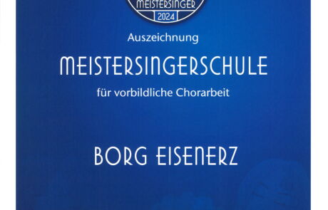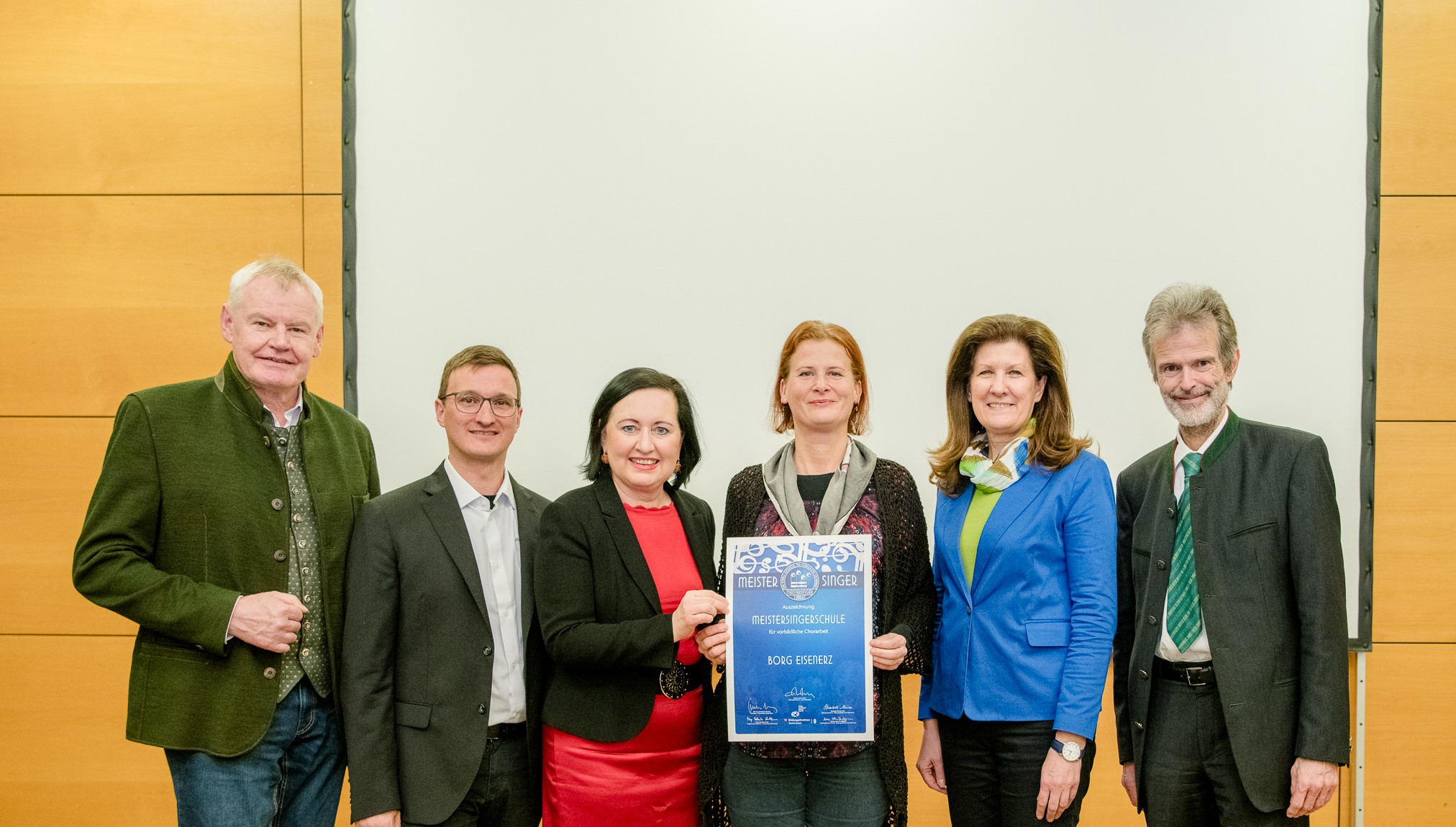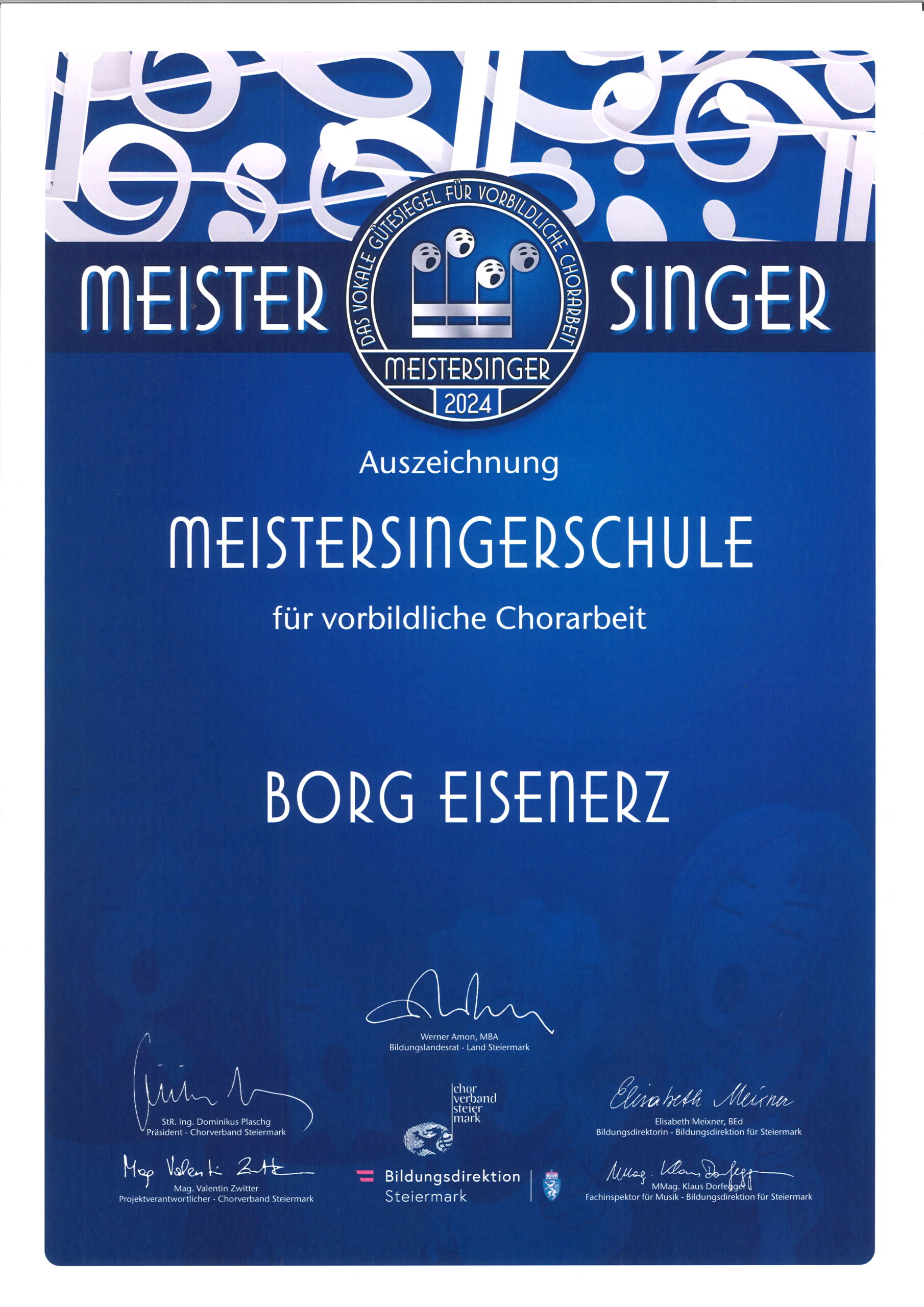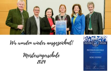 Am 7. März 2024 wurde unsere Schule im Rahmen einer stimmungsvollen und äußerst gut besuchten Feier zum wiederholten Male mit dem Meistersingergütesiegel ausgezeichnet. Meistersingerschulen erfüllen Kriterien und schaffen Bedingungen, die aktives Chorleben und singende Jugendliche an den Schulen ermöglichen. Es gratulierten herzlich Fachinspektor MMag. Klaus Dorfegger, Mag. Valentin Zwittter, Bildungsdirektorin Elisabeth Meixner, in Vertretung des Landeshauptmannes Barbara Riener und der Präsident des Chorverbandes Dominikus Plaschg.