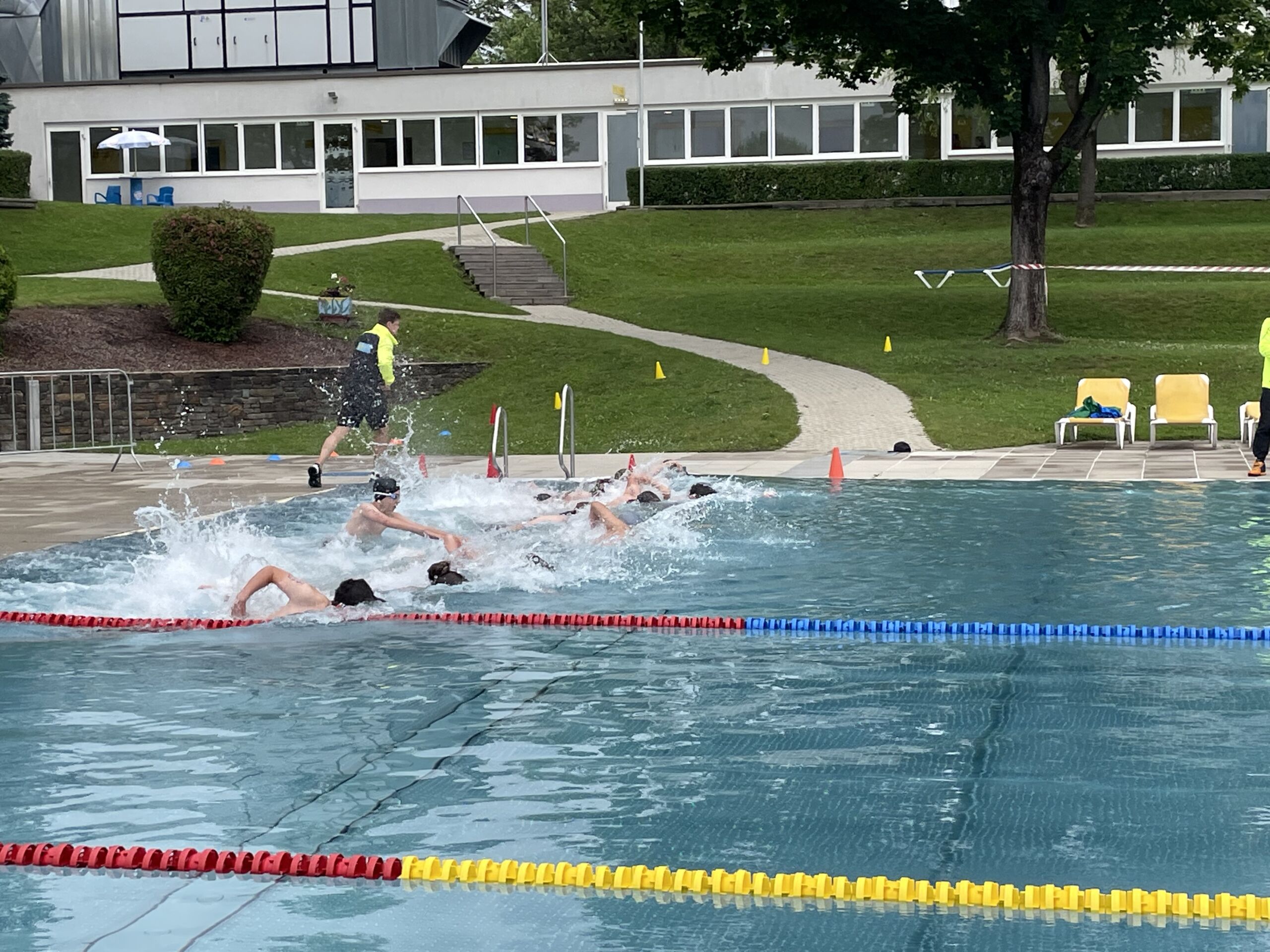 Begonnen wird der Aquathlon mit einem Massenstart aus dem Wasser, worauf folgend eine Schwimmdistanz von 200m Freistil absolviert werden muss. Anschließend wird die Schwimmbrille in der Wechselzone abgelegt und umgehend mit dem Lauf begonnen. Der 1600m lange Lauf, der über 4 Runden führt und sowohl Steigungen als auch enge Kurven beinhaltet, fordert sehr gutes Durchhaltevermögen und verlangt den Jugendlichen noch einmal alles ab.