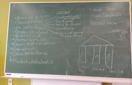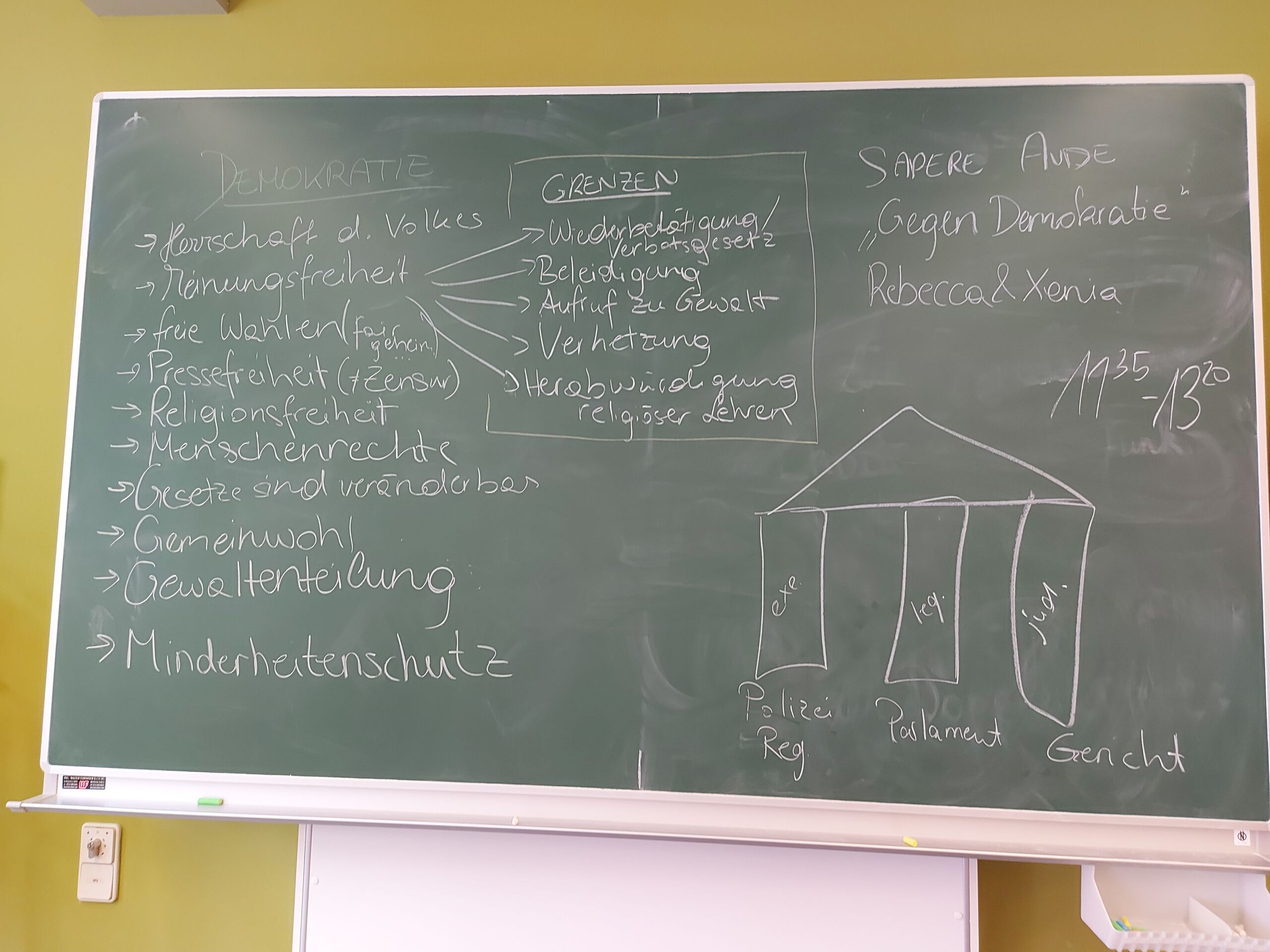 „Die Demokratie setzt die Vernunft im Volke voraus, die sie erst hervorbringen muss.“ (Karl Jaspers) An mehr politischer Vernunft bei unseren Schüler:innen der 6. bis 8. Klasse arbeiteten am 31. März zwei Trainerinnen des Vereins „Sapere aude!“ (Übers.: „Habe Mut, dich deines Verstandes zu bedienen! / kritisch zu denken!“). Der Workshop diente einer Auseinandersetzung mit Extremismus, Populismus und Verschwörungserzählungen und vermittelte den teilnehmenden Schülern deren demokratiefeindliches Potenzial.
