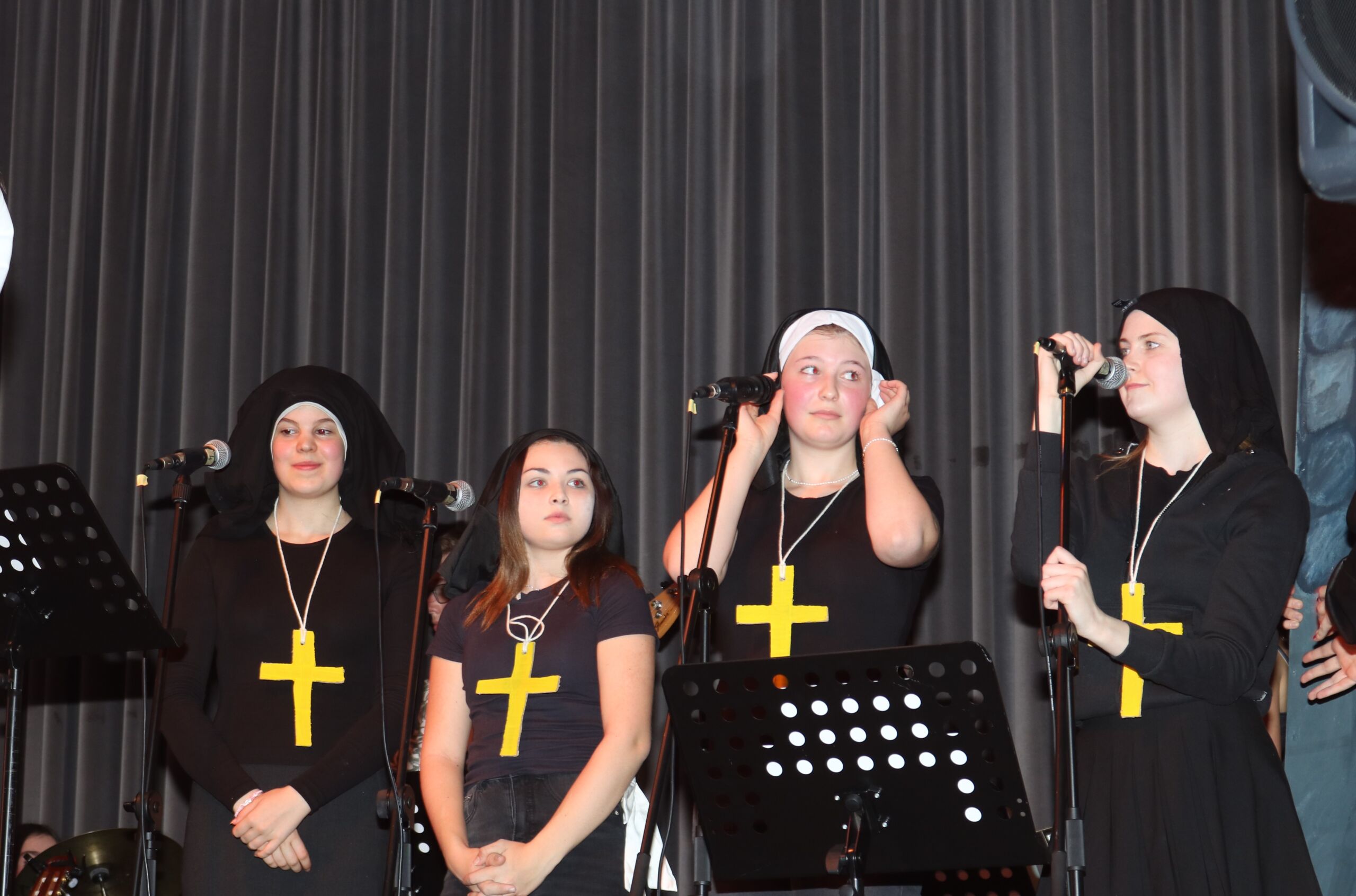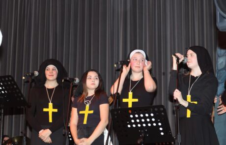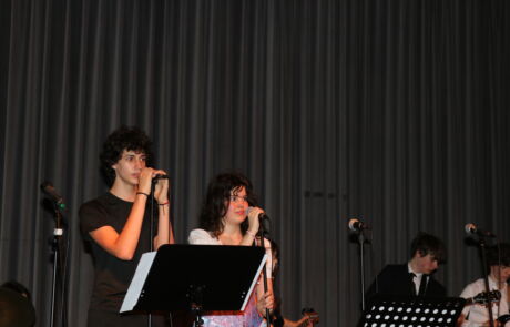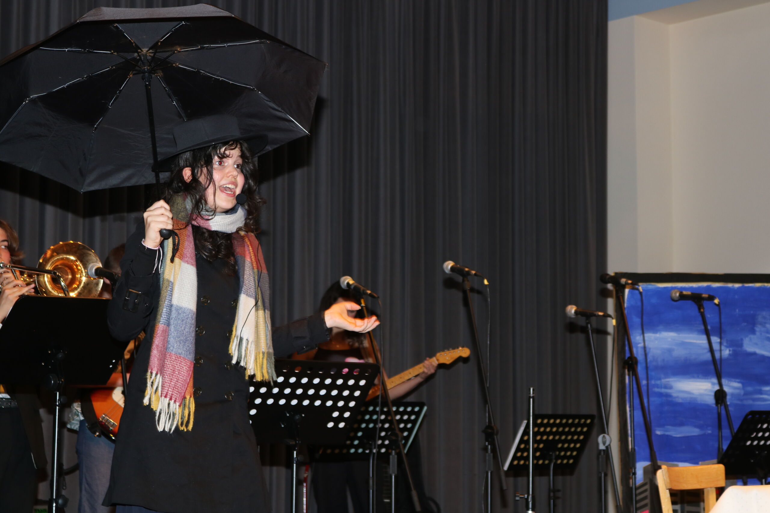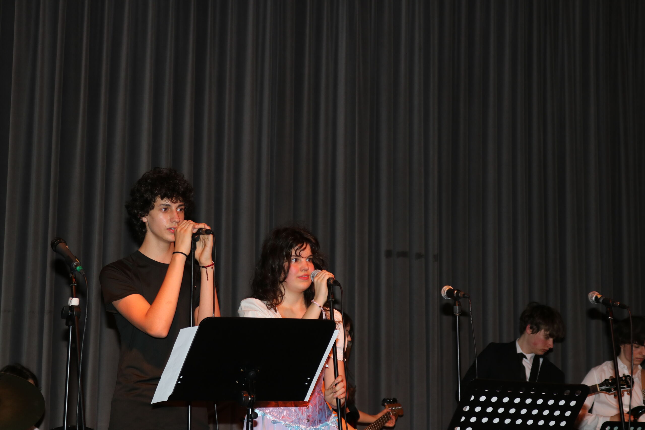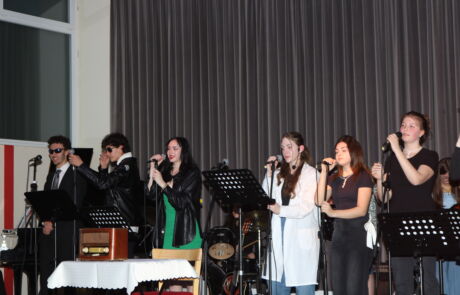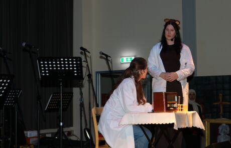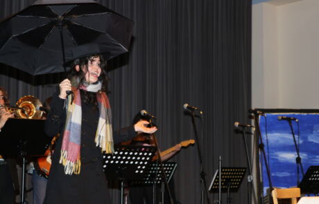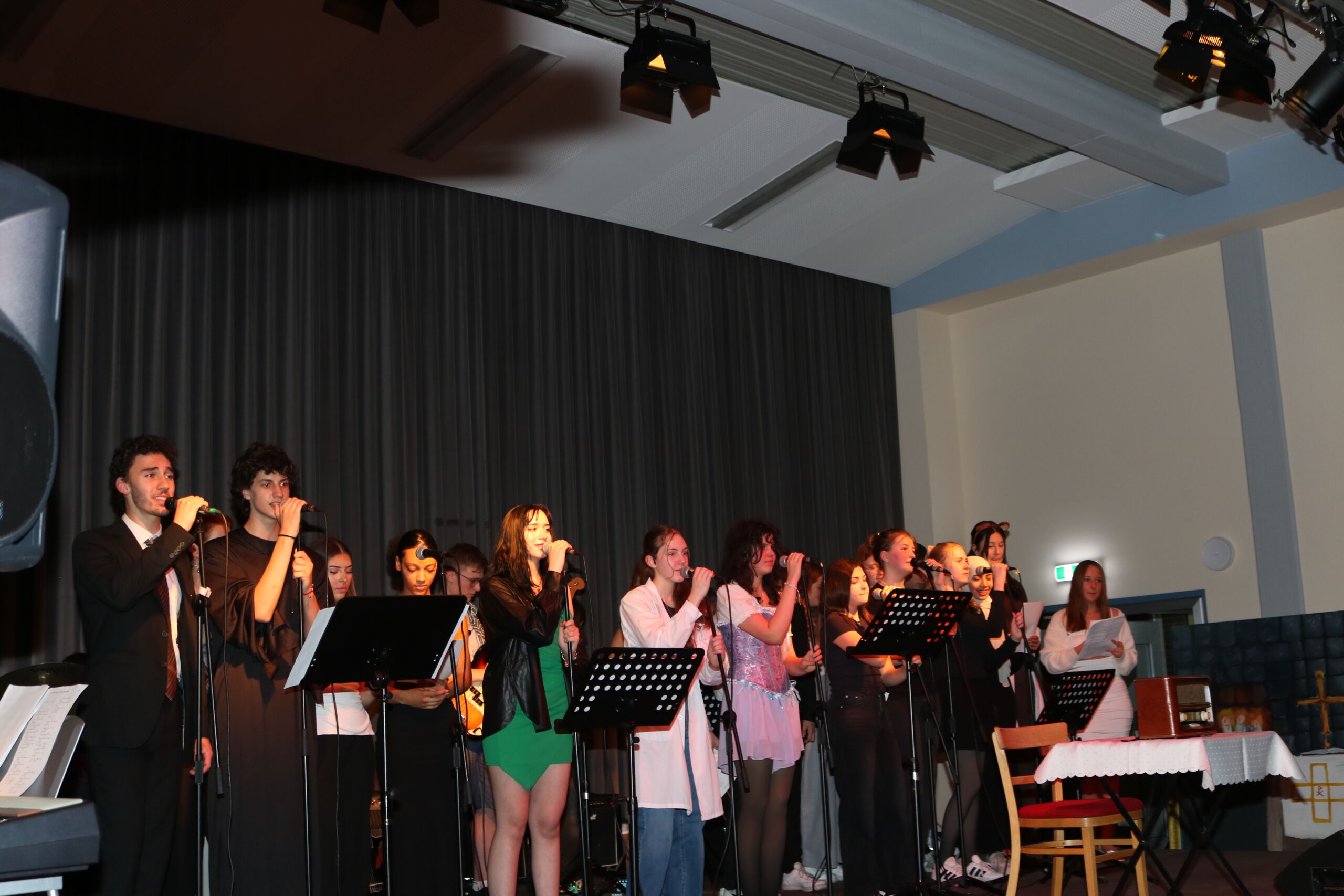 Die Musiker:innen des BORG Eisenerz präsentierten begleitend zum Schauspiel ein abwechslungsreiches und ansprechendes Musikprogramm, das die Zeitreise der Wissenschaftlerin und ihres Affen stimmungsvoll mit Musik aus Filmen der jeweiligen Jahrzehnte untermalte. Dazu gab es noch passende Requisiten und eine vielseitige Bühnendekoration.