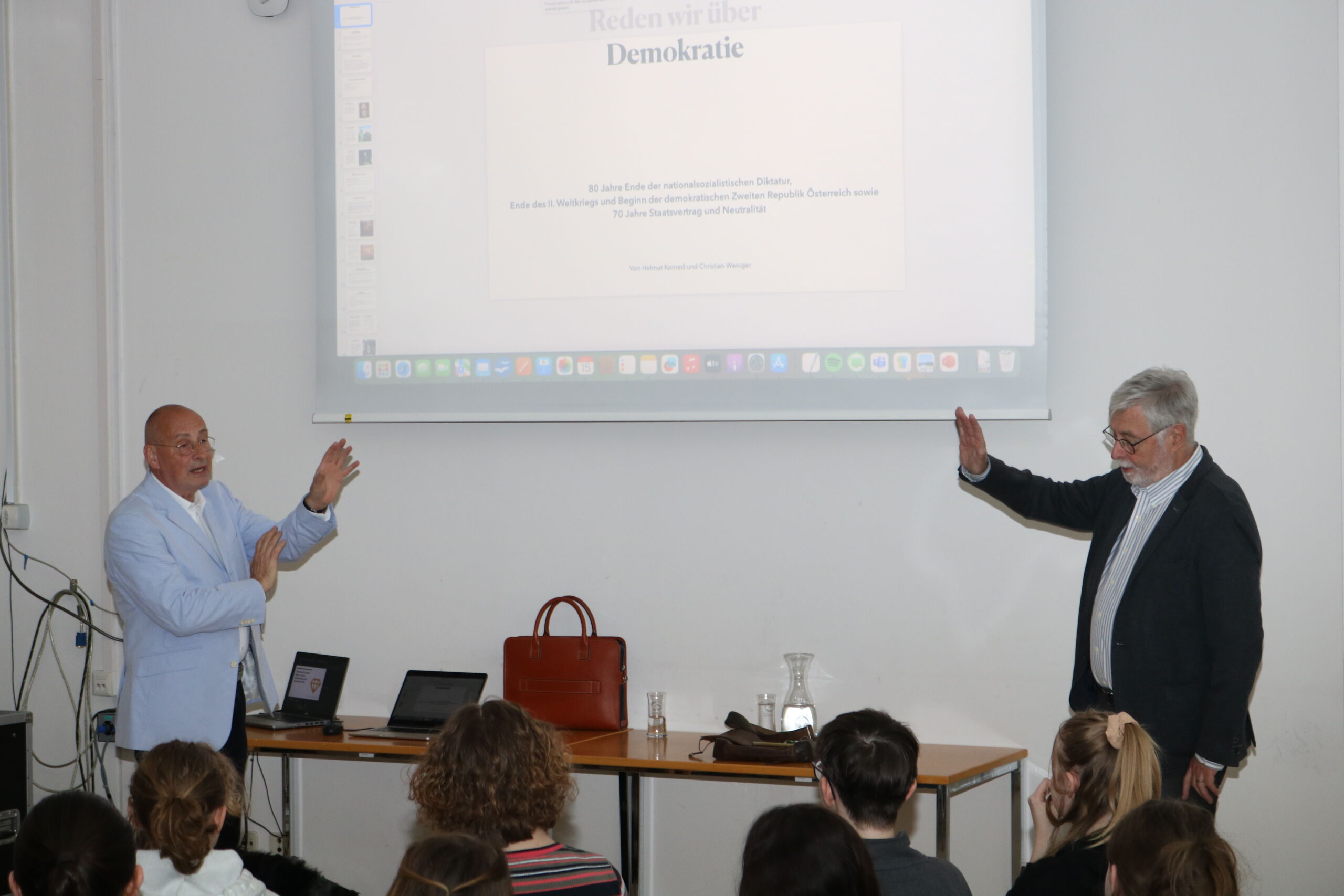 Auf den Tag 70 Jahre nach Unterzeichnung des Staatsvertrages, der Österreich im Jahr 1955 wieder zu einem souveränen Staat werden ließ, arbeiteten 80 Schüler:innen des BORG Eisenerz im Rahmen des Projekts „Reden wir über Demokratie“ mit Christian Weniger, dem ehemaligen Chef vom Dienst der Kleinen Zeitung, und Helmut Konrad, dem ehemaligen Rektor der Universität Graz und emeritierten Universitätsprofessor für Zeitgeschichte.