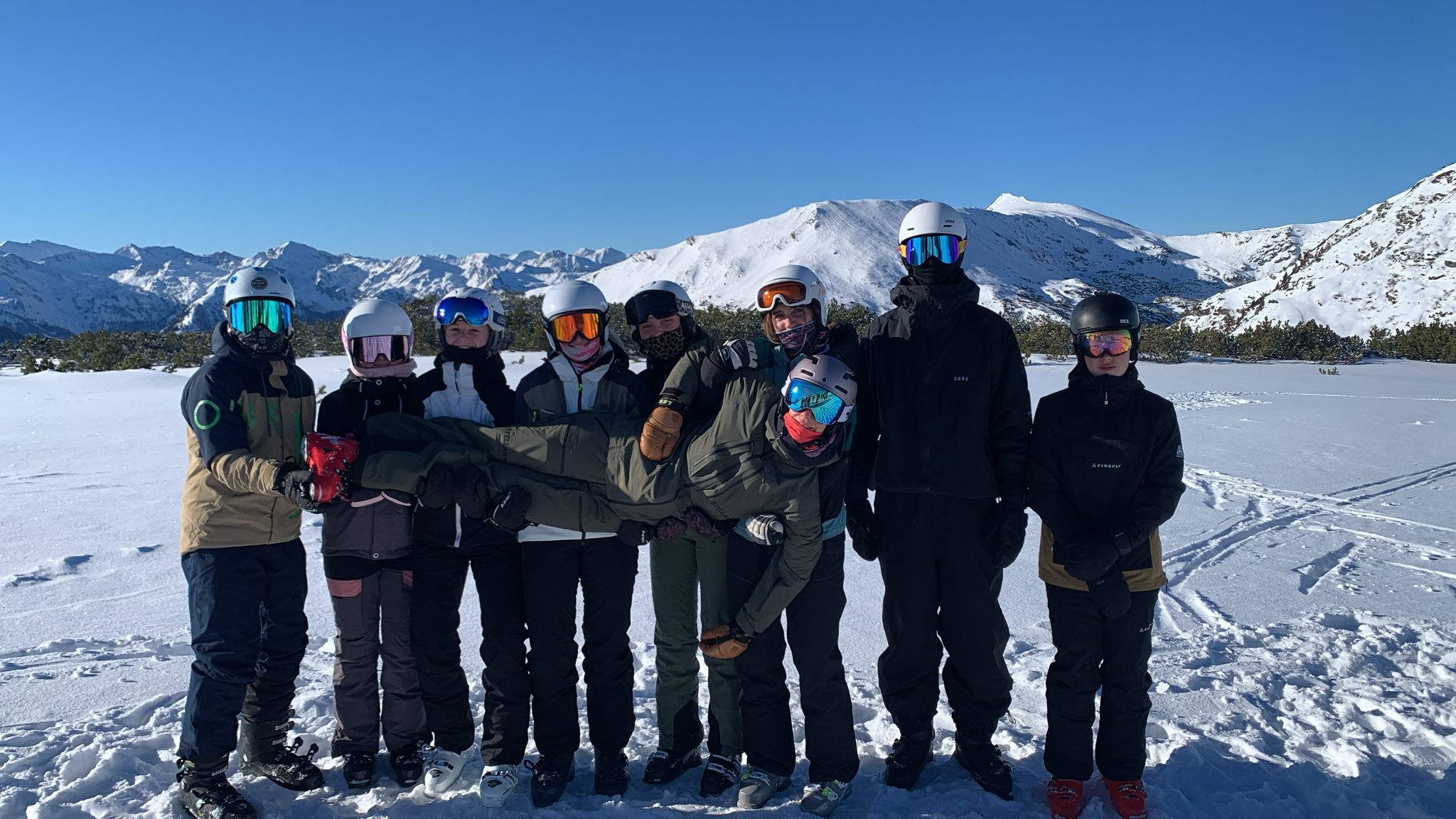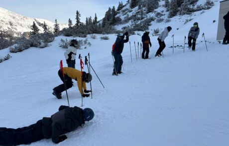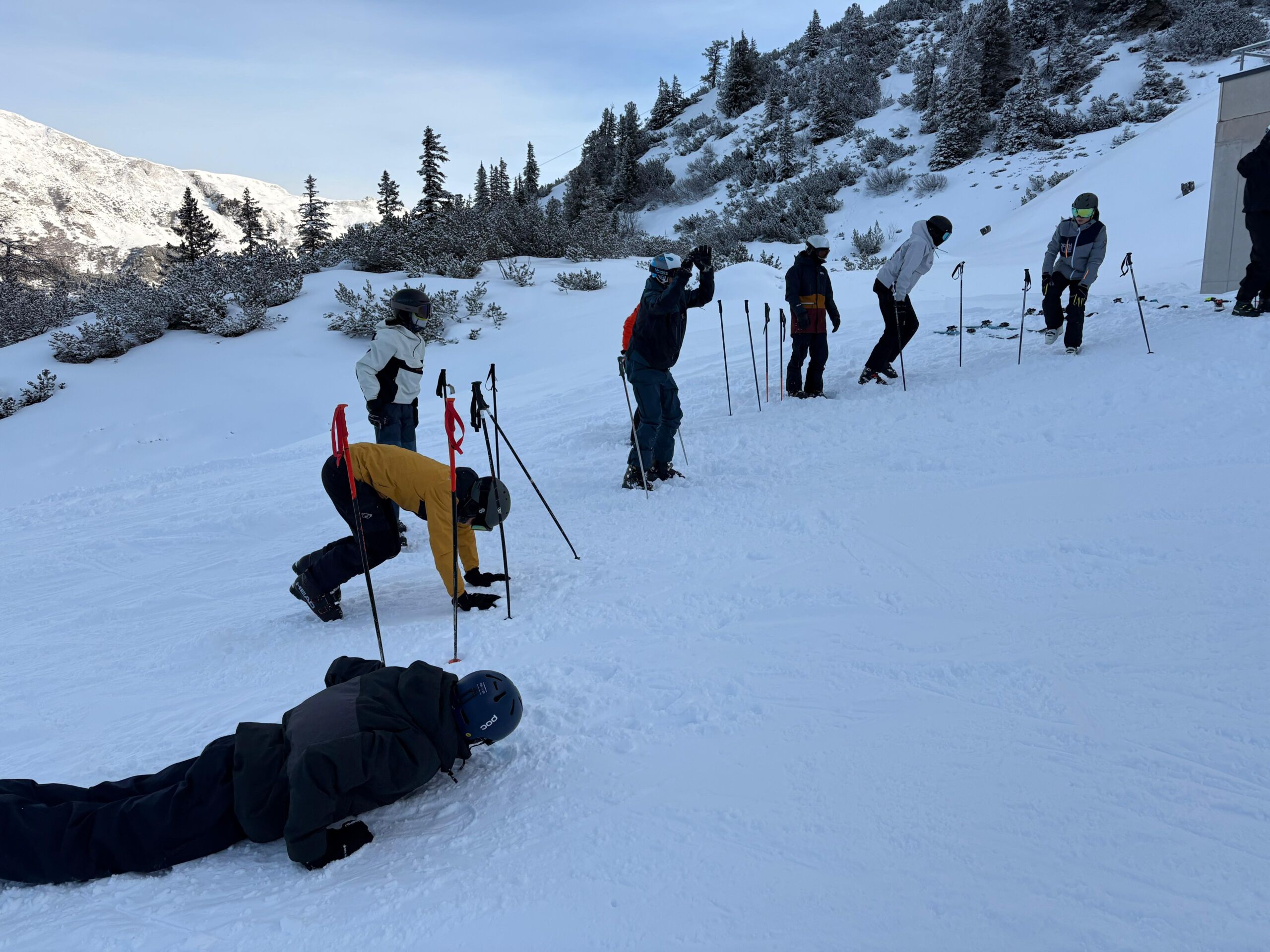 Ein informativer Lawinenvortrag mit anschließendem praktischem Teil im Schnee vertiefte die Sicherheitskompetenz der Schüler:innen. Dabei mussten mithilfe von LVS-Geräten und Sonden drei vergrabene Rucksäcke lokalisiert und danach mithilfe von Lawinenschaufeln ausgegraben werden.