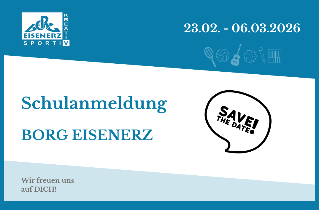 Markus Maier2025-12-15T11:48:40+01:00Du weißt noch nicht, wie es nach der Unterstufe weitergehen soll? Dann laden wir dich zu einer Schulführung oder einem Schnuppertag am BORG Eisenerz ein! Die Schulwahl nach der Unterstufe fühlt sich oft größer an, als sie eigentlich ist. Mit 13 oder 14 soll man plötzlich wissen, wohin die Reise geht – dabei ist es ganz normal, wenn man noch keine klare Vorstellung hat. Vielleicht weißt du noch nicht genau, wohin dein Weg führen soll. Vielleicht magst du Musik, Kunst & Design, Sport & Gesundheit, Naturwissenschaften oder Sprachen. Möglicherweise interessiert dich auch vieles? Am BORG Eisenerz kannst du deine Talente [...]